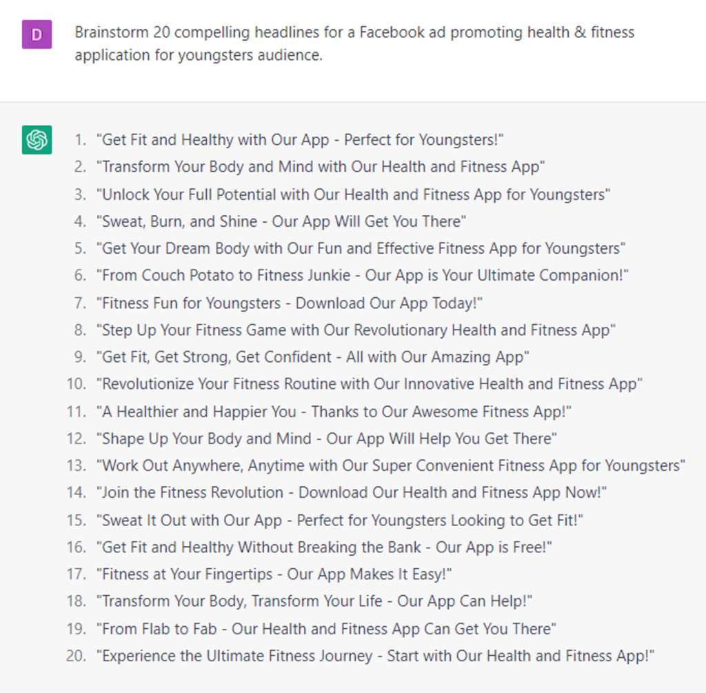 Brainstorm 20 compelling headlines for a Facebook ad promoting [product] for [audience].