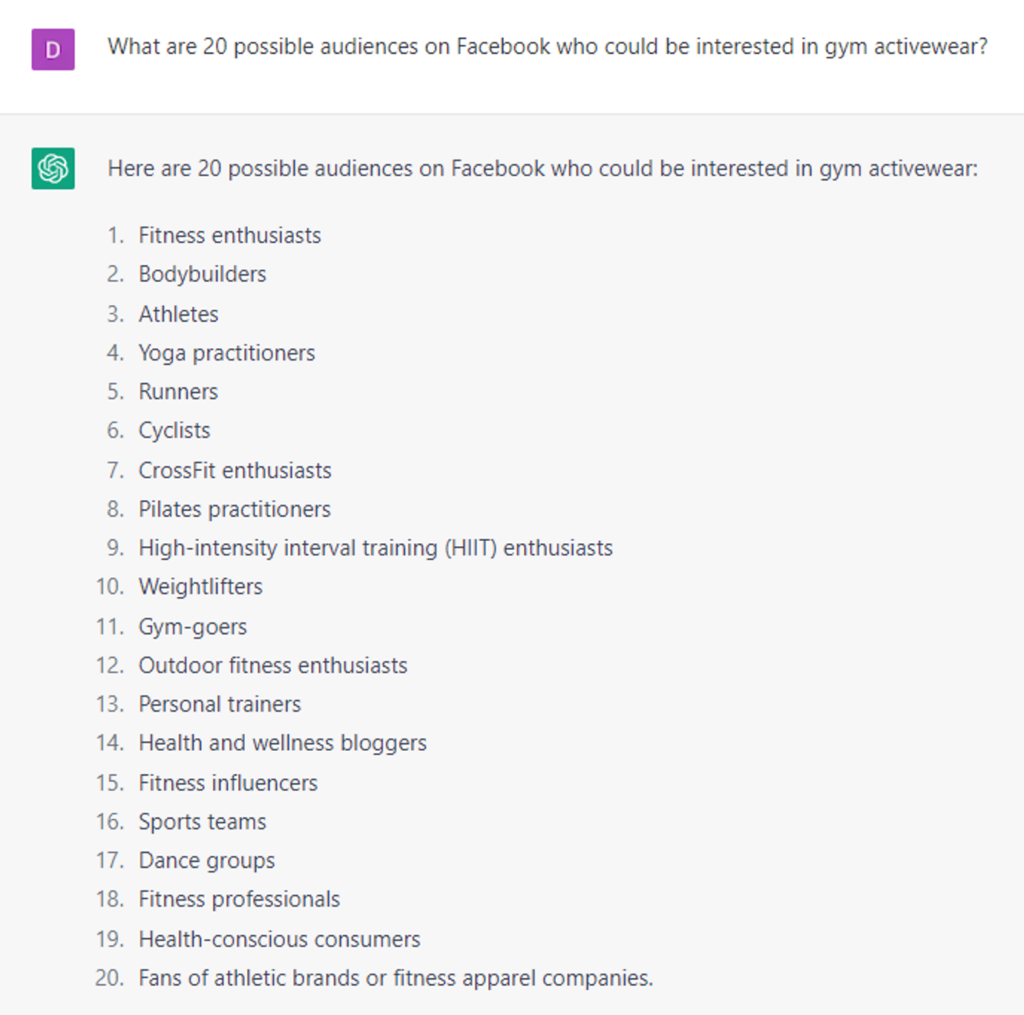 What are 20 possible audiences on Facebook who could be interested in [product]?