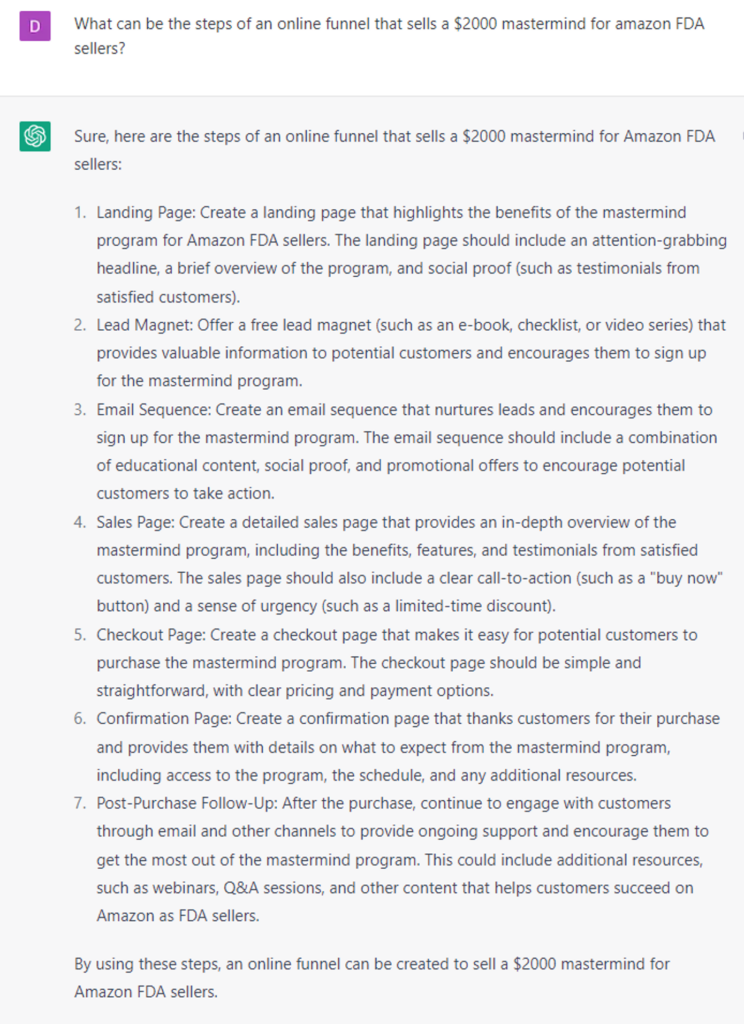 - “What can be the steps of an online funnel that sells a $2000 mastermind for amazon FDA sellers?”