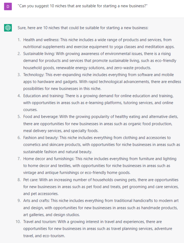 - "Can you give me 10 niche ideas for starting a new business that have potential for high growth?"
