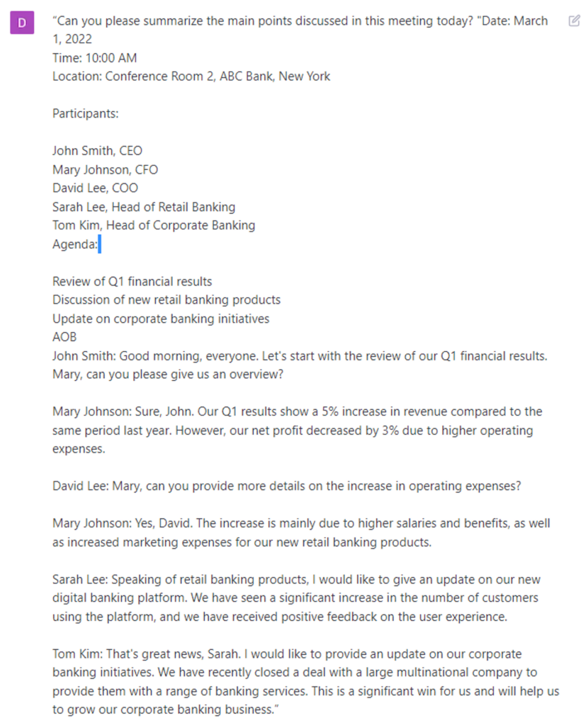 - “Can you please summarize the main points discussed in this meeting today? [[copy and paste transcript of the meeting].”