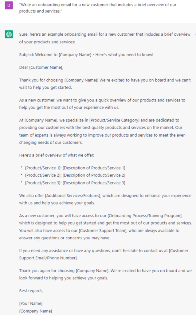 - "Write an onboarding email for a new customer that includes a brief overview of our products and services."